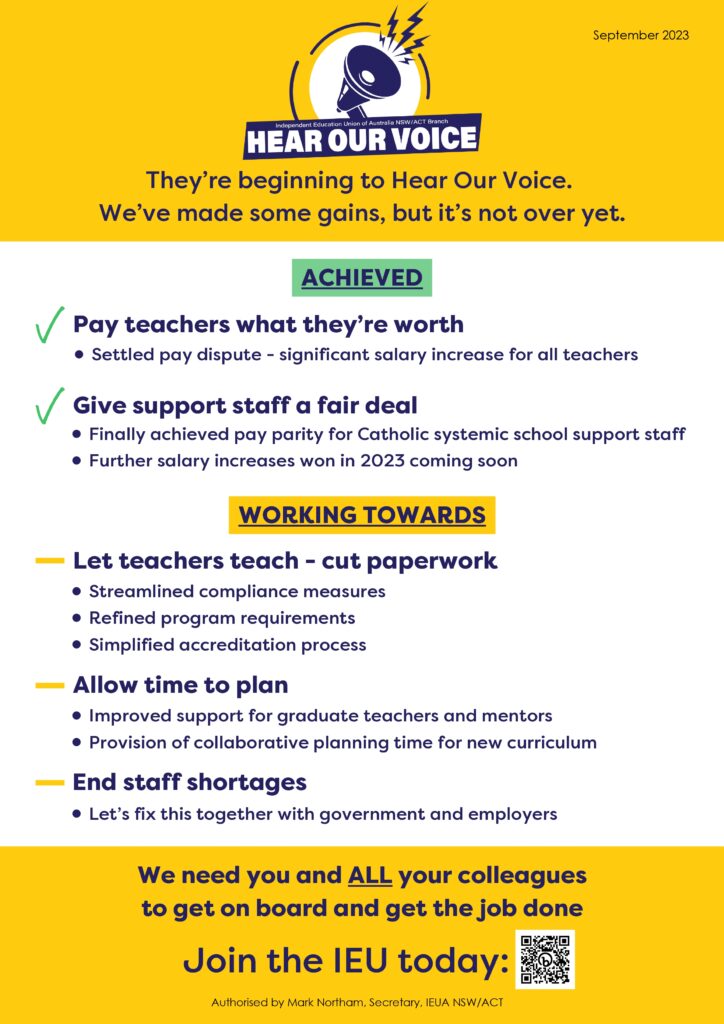 In 2023, following a long battle we have achieved salary parity for support staff working in catholic systemic schools. We also welcomed the Diocese of Broken Bay in making a separate enterprise agreement that offers rates of pay above those in NSW government schools. This step was unprecedented but a pathway to ensure IEU members receive the conditions they deserve.